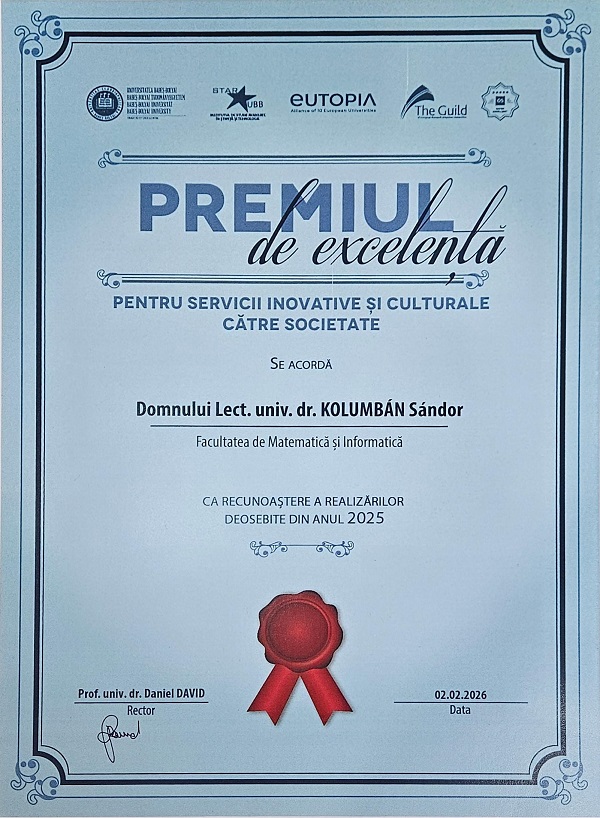 A Magyar Matematika és Informatika Intézet oktatója, dr. Kolumbán Sándor egyetemi adjunktus, az Innovatív és kulturális társadalmi tevékenységek kategóriában kapott kitüntetést.