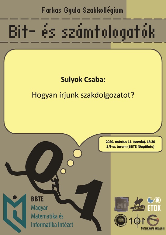 Ezen a héten is lesz Bit- és számtologatók, a már megszokott helyszínen és időpontban, azaz 5/I, szerda 18:30, kivételesen a Mat-Infó KMDSZ szakosztály szervezésében, melynek keretében Sulyok Csaba fog beszélni a szakdolgozatírás mikéntjéről.