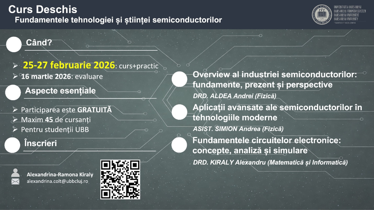 Facultatea de Matematică și Informatică împreună cu Facultatea de Fizică organizează un curs deschis de introducere în fundamentele tehnologiei și științei semiconductorilor, destinat studenților sau altor persoane interesate de semiconductori și cum stau aceștia la baza tehnologiilor moderne.