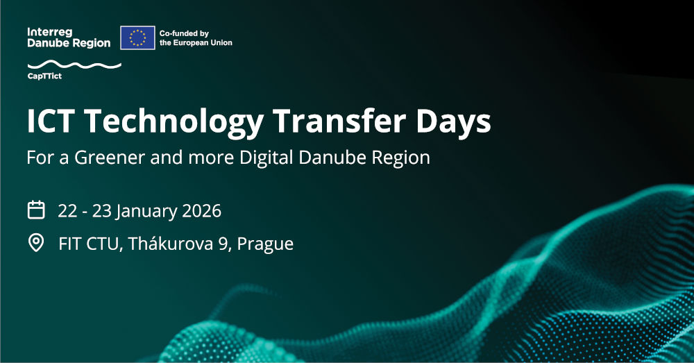 Vă invităm să participați la conferința ICT Technology Transfer Days: For a Greener and more Digital Danube Region, care se va desfășura în perioada 22–23 ianuarie 2026 la Universitatea Tehnică Cehă din Praga, Cehia, în cadrul proiectului Interreg “Enhancing capacities for technology transfer, company building and innovations in the field of ICT (CapTTict)” (https://interreg-danube.eu/projects/capttict).