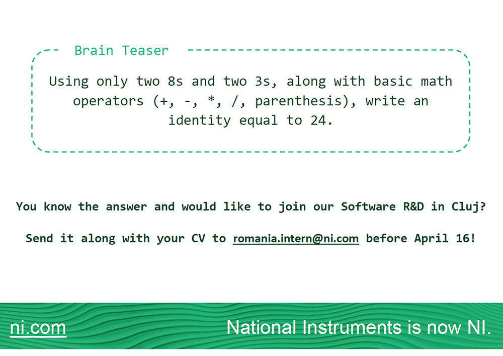 National Instruments te invita sa aplici la programul de Summer Internship, organizat in cadrul biroului de Cercetare & Dezvoltare Software din Cluj-Napoca, cladirea The Office.
