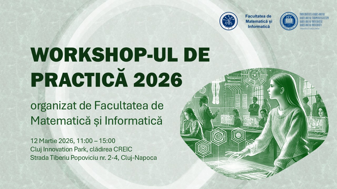 Workshop-ul de practică din anul universitar 2025-2026 se va desfășura fizic la data de 12 martie 2026, între orele 11-15 în holul clădirii CREIC, Cluj Innovation Park, str. Tiberiu Popoviciu, nr. 2-4, Cluj-Napoca.