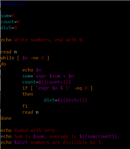 3. Write a shell script that reads numbers until 0 and computes the sum, average of the numbers and counts how many are multiples of 5.