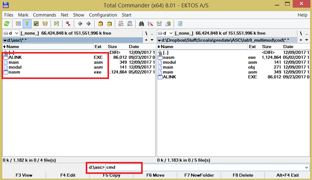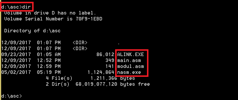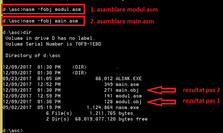 - Fie directorul asc pe discul D, în acest director se găsesc sursele programului (main.asm și modul.asm);