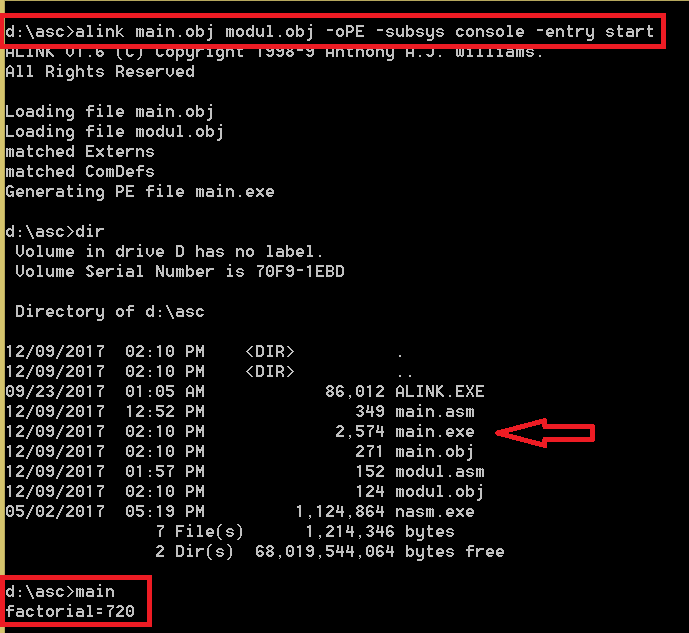 - folosind alink.exe (editor de legături), din cele două fișiere .obj se creează programul executabil, numele fișierului .exe rezultat este identic cu primul fișier .obj dat ca și parametru editorului de legături, în acest caz main. Programul poate fi rulat, în acest caz main.exe afișează pe ecran 6! = 720 (a se vedea figura de mai jos)
