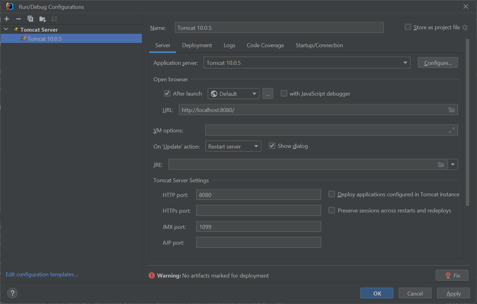 "No artifacts marked for deployment" with a "Fix" button that helps you set the artifact for deployment on Tomcat as